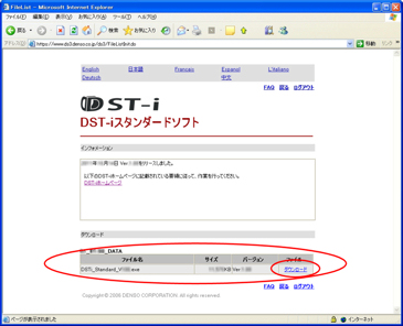- ダウンロード画面に表示されているファイル(DST-iスタンダードソフト)をダウンロードします。(「ダウンロード」 をクリックする)
