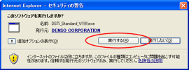 - 本DST-iにてユーザ登録が済んでいない場合には、インターネットエクスプローラが起動してセキュリティ警告画面が表示されますので「OK」をクリックします。